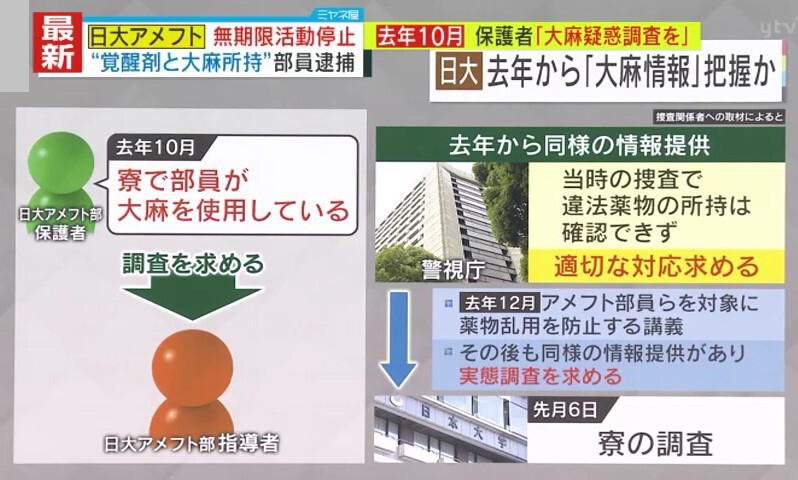 さらに、日大側が“大麻情報”を2022年から把握していたのではないか、という話も出ています。捜査関係者への取材によると、日大アメフト部の保護者が2022年10月、「寮で部員が大麻を使用している」との情報をアメフト部の指導者に伝えた上で、「調査をしてほしい」と求めていたことがわかりました。同様の情報提供は2022年から警視庁にもありましたが、当時の捜査では違法薬物の所持は確認できませんでした。警視庁は大学側に適切な対応を求めたほか、2022年12月にはアメフト部員らを対象に「薬物乱用を防止する講義」も行ったということです。しかし、その後も同様の情報提供があり、警視庁が実態調査をするよう求めたところ、2023年7月6日になって大学が寮の調査を行いました。