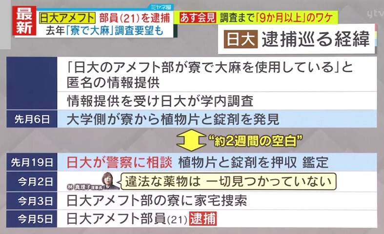 今回の家宅捜索までの流れには、疑問点が指摘されています。発覚のきっかけとなった匿名からの情報提供を受け、日大は監督・コーチ・退部者を含む部員全員への聞き取りや、大学関係者がアメフト部の寮を立ち入り調査するなどの学内調査を行いました。そして7月6日、大学側はアメフト部寮内で「植物片」と「錠剤」を発見しましたが、警察に相談し薬物を押収鑑定されたのは19日で、そこには約2週間のタイムラグが存在します。