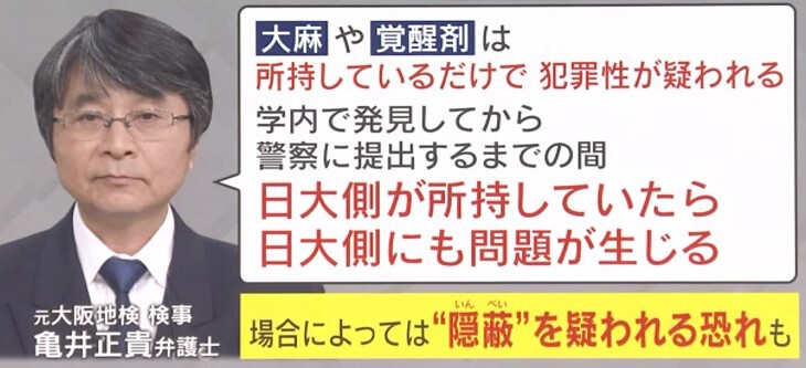 この疑問点について弁護士の亀井正貴氏は、「大麻や覚醒剤は、所持しているだけで犯罪性が疑われる。学内で発見してから警察に提出するまでの間、日大側が所持していたら、日大側にもも問題が生じる」として、「場合によっては隠蔽を疑われる恐れもある」と指摘しています。