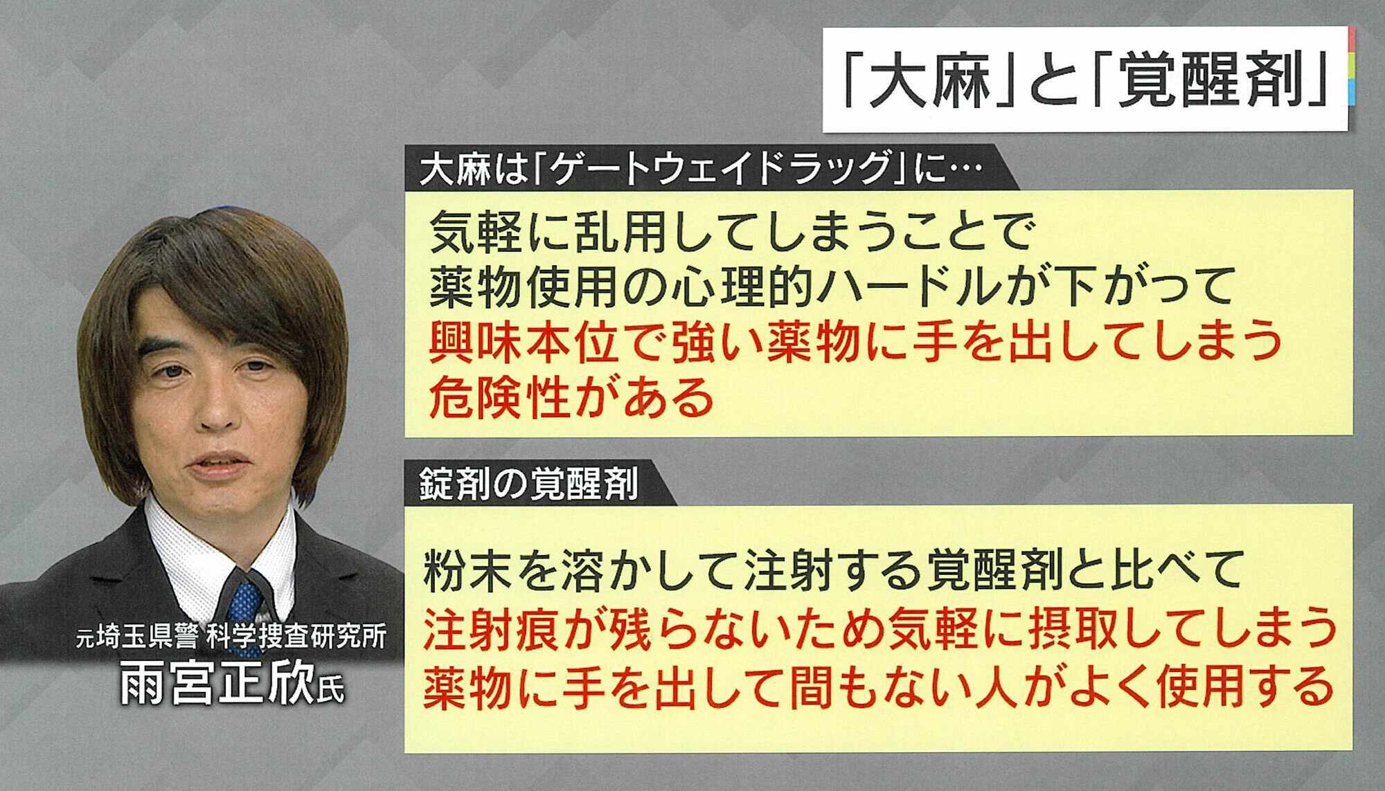 元埼玉県警科学捜査研究所・雨宮正欣氏によると、大麻は「気軽に乱用してしまうことで、薬物使用の心理的ハードルが下がって、興味本位で強い薬物に手を出してしまう可能性がある」、錠剤の覚醒剤は「粉末を溶かして注射する覚醒剤と比べて、注射痕が残らないため、気軽に摂取してしまう。薬物に手を出して間もない人が、よく使用する」ということです。
