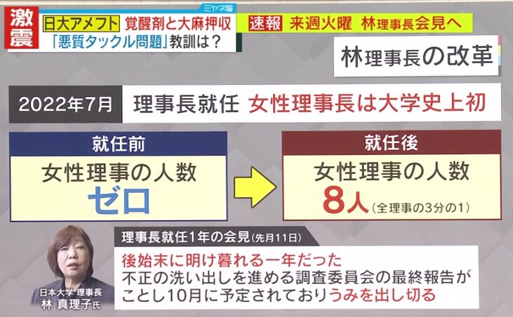 林真理子理事長が日大の理事長に就任したのは、2022年7月のことでした。女性理事長は日大史上初のことで、林理事長就任後には、元はゼロだった女性理事の数が全理事の3分の1に当たる8人に増えるなど、改革を進めてきました。2023年7月11日、理事長就任1年の会見では、「後始末に明け暮れる一年だった。不正の洗い出しを進める調査委員会の最終報告が2023年10月に予定されており、うみを出し切る」と語っていました。