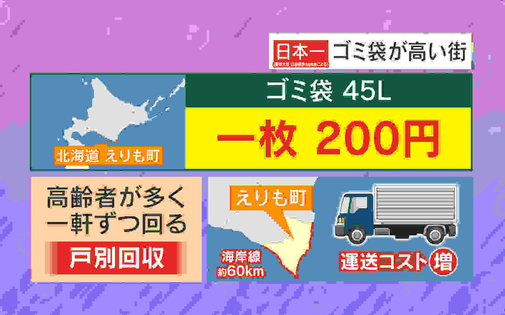 ただ、45Lのゴミ袋が一枚200円と高額の自治体も。北海道えりも町は、高齢者が多く戸別回収であること、また海岸線約60kmという距離があって運送コストがかかることから、東洋大学・山谷名誉教授によると「日本一ゴミ袋が高い街」だということです。