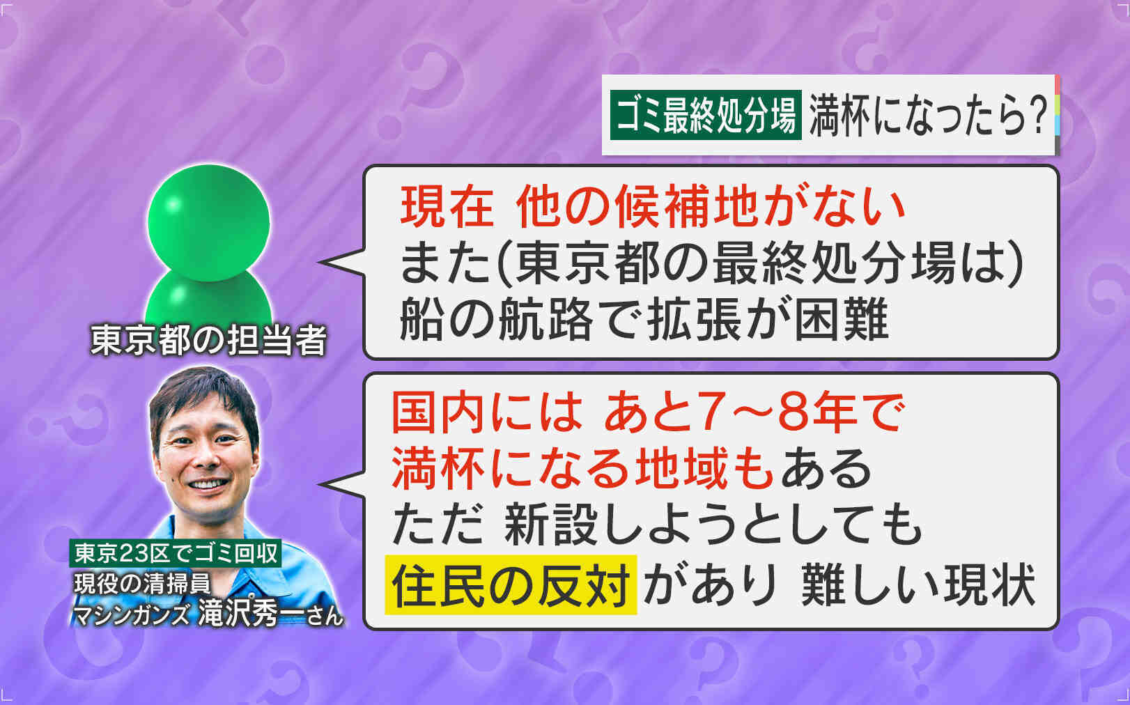 東京23区でゴミを回収する現役の清掃員でもあるお笑い芸人、マシンガンズ・滝沢秀一さんによると、「国内には、あと7~8年で満杯になる地域もある。ただ、新設しようとしても住民の反対があり、難しい現状」ということです。