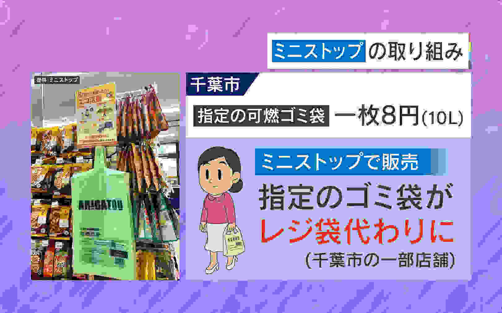 また、その他の地域の取り組みとして、千葉市のミニストップ(一部店舗)では、指定の可燃ゴミ袋を一枚8円(10L)で販売。それがレジ袋代わりになっているということです。