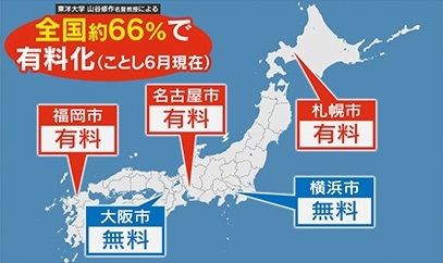 東洋大学・山谷修作名誉教授によると、2024年6月現在で、ゴミ袋を有料化している自治体は全国で約66%。福岡市・名古屋市・札幌市などでは有料、大阪市・横浜市などでは無料となっています。