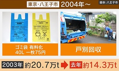 東京・八王子市では、2004年から『ゴミ袋の有料化(40L・一枚75円)』と『一軒ずつ回る戸別回収』を開始。その結果、2003年に約20.7万tあったゴミが、2023年には14.3万tまで減っています。