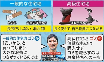一方、高級住宅地では、運動用品など“長く使えて自己投資につながるもの”が多く、そもそもゴミの量も少ないといいます。「無駄なものは購入せずゴミを減らすのは、お金持ちへの一歩」だと話していました。