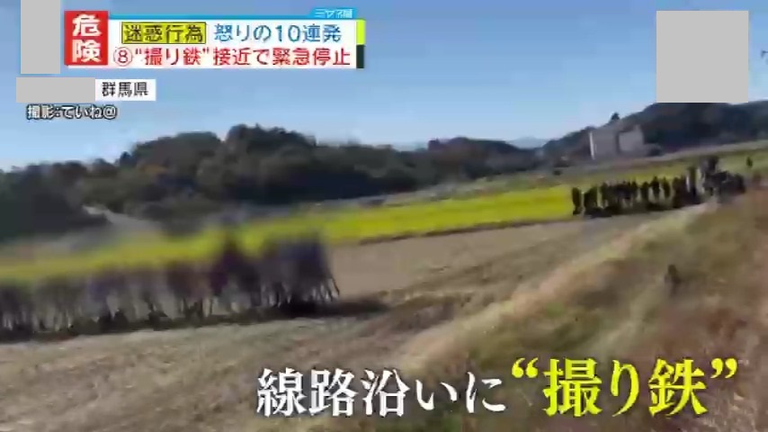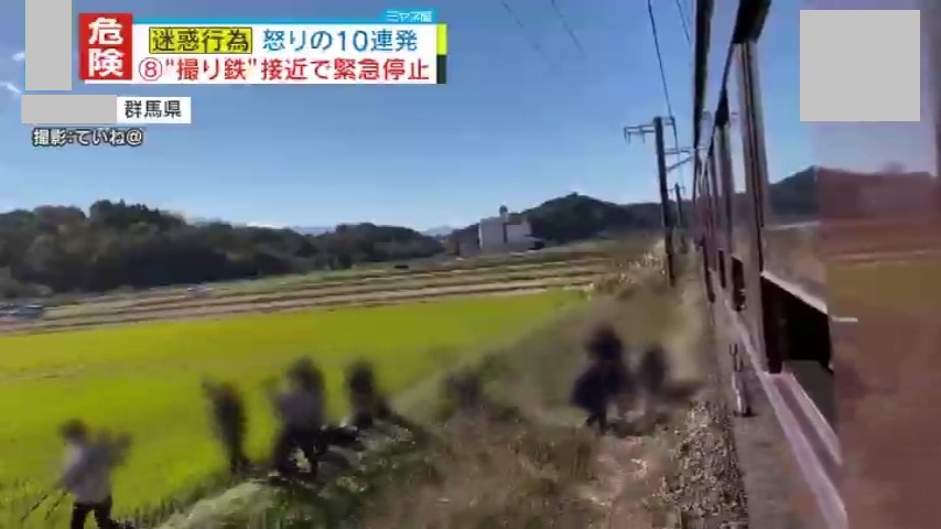 すると突然、列車が急停車。その脇には、線路内にまで侵入し、撮影をしている“撮り鉄”たちの姿がありました。走る列車の間際まで接近し、危険極まりない行為です。その後、猛ダッシュで逃げ去っていく様子も映っていました。