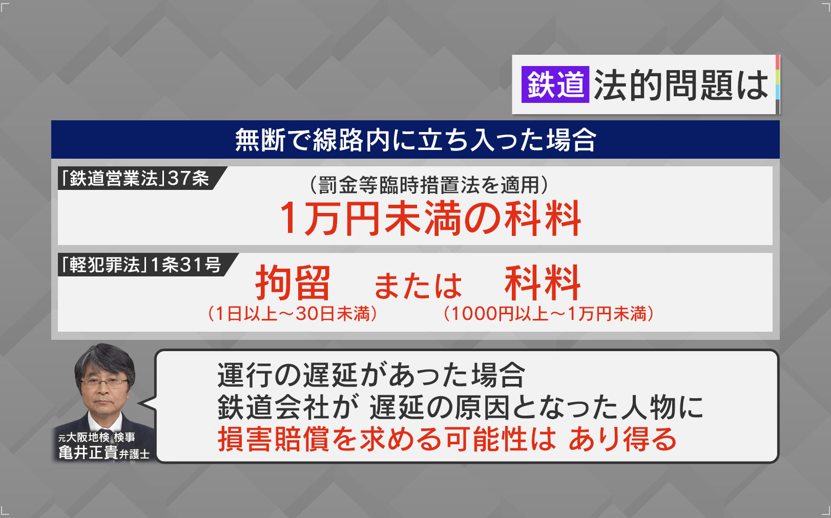 では、これらの行動の法的問題はどうなるのでしょうか。無断で線路内に立ち入った場合、「鉄道営業法」37条で、1万円未満の科料(罰金等臨時措置法を適用)。また、「軽犯罪法」1条31号では1日以上~30日未満の拘留、または1000円以上~1万円未満の科料となります。元大阪地検・検事の亀井正貴弁護士によると「運行の遅延があった場合、鉄道会社が遅延の原因となった人物に損害賠償を求める可能性はあり得る」と話しています。