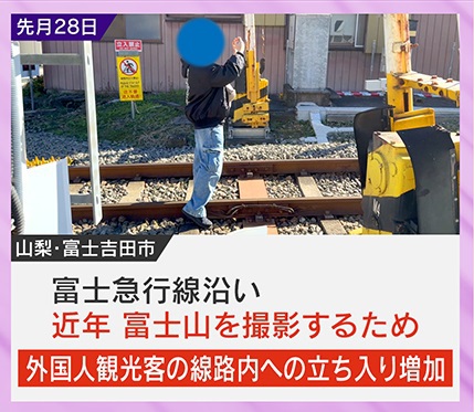 すると、カメラを向けたまま、線路内に侵入し、そのまま数分間、撮影を続けていました。周辺住民によると、特に富士山がきれいに見える朝方に、線路内に立ち入る外国人観光客が多いといいます。