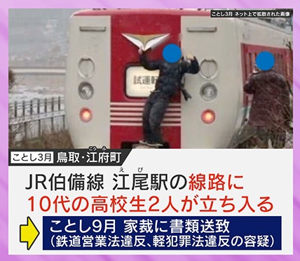 警察は、鳥取県内の駅構内に正当な理由なく立ち入ったなどとして、『鉄道営業法違反』などの疑いで、兵庫県と神奈川県に住む10代の男子高校生2人を家庭裁判所に書類送致しました。