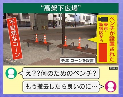 同じく東京・新宿区の“高架下広場”ではベンチの上に不自然なコーンが設置されたそうです。「え??何のためのベンチ?」「もう撤去したら良いのに…」などの声が上がっています。