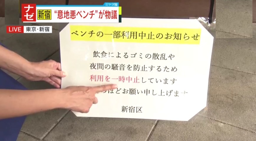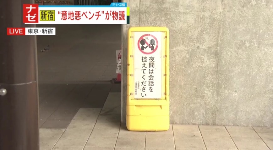 新宿にある“意地悪ベンチ”と呼ばれるイスが物議をかもしています。一般的にベンチといえば、座って本を読んだりご飯を食べたりするなどリラックスできる場所なのですが、こちらのベンチは座面がアーチ状になっています。一体なぜなんでしょう?