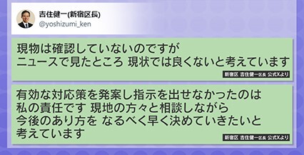これに対しても、新宿区・吉住区長は「現物は確認していないのですが、ニュースで見たところ現状では良くないと考えています」「有効な対応策を発案し指示を出せなかったのは、私の責任です。現地の方々と相談しながら、今後のあり方をなるべく早く決めていきたいと考えています」と、『X』に投稿しています。