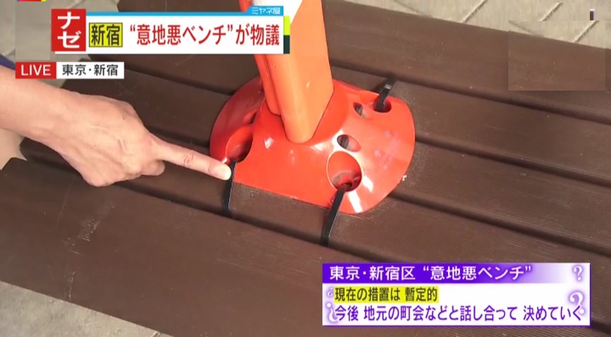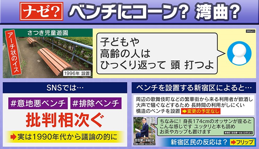 東京・新宿区にある「さつき児童遊園」に1996年に設置されたアーチ型のイスですが、「子どもや高齢の人はひっくり返って頭打つよ」との声が上がっていました。SNSでも「#意地悪ベンチ」「#排除ベンチ」と批判が相次いでいます。