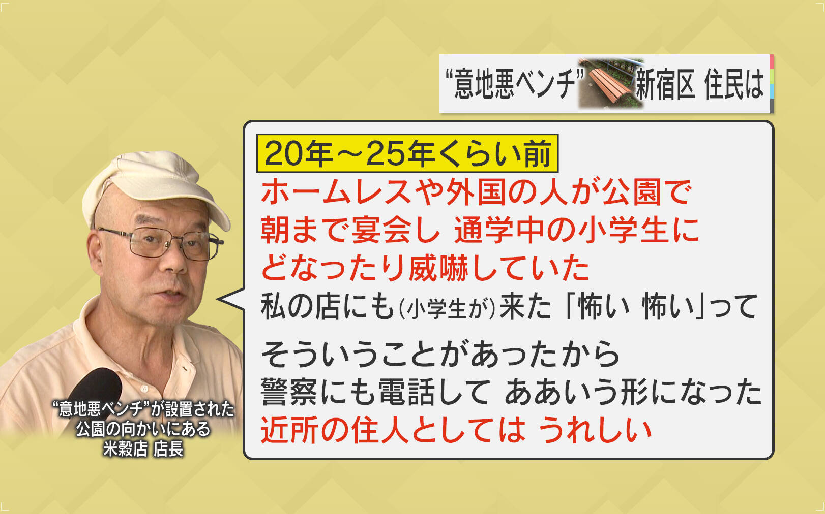 “意地悪ベンチ”が設置された公園の向かいにある米穀店の店長は「20年~25年くらい前、ホームレスや外国の人が公園で朝まで宴会し、通学中の小学生にどなったり威嚇していた。私の店にも(小学生が)来た、『怖い 怖い』って。そういうことがあったから警察にも電話して、ああいう形になった。近所の住人としてはうれしい」と話しています。
