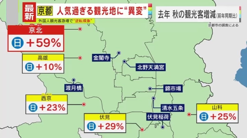 その一方、調査で見えてきたのが、日本人客が『定番スポット』から『穴場スポット』を選び旅行しているということです。市の調査によると『山科』や『伏見』『西京(にしきょう)』など、周辺の観光地では日本人客が20%以上増加しています。中でも京都市北西部の『京北(けいほく)』エリアでは前年の同じ時期と比べ59%も増えているといいます。