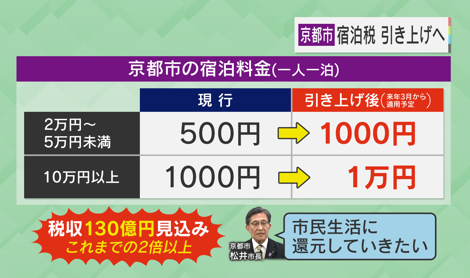 京都市では宿泊料金に応じて宿泊税を取っていて、今は最大でも1000円ですが、2026年3月からは 1万円に引き上げるということです。税収130億円の見込みで、これまでの2倍以上になります。京都市の松井市長は「市民生活に還元していきたい」と話しています。
