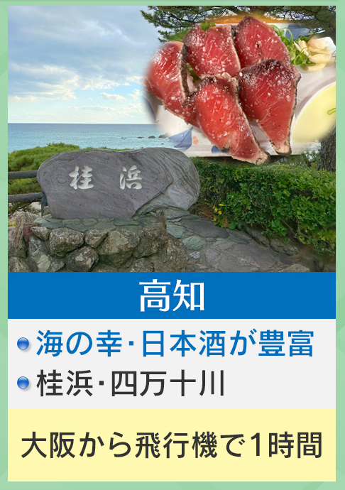 そして『高知』ですが、海の幸・日本酒が豊富です。また海も川も楽しめ、大阪からは飛行機で1時間もかかりません。