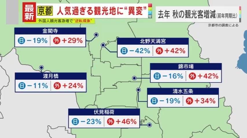 京都市が2024年と2023年の秋に調査した観光客数の推移では、伏見稲荷などの定番の観光地では外国人観光客が軒並み急増し、2023年に比べ約30%増えているのに対し、日本人客は、約15%減少したことが明らかになりました。