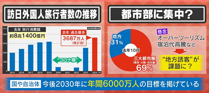 2024年の訪日外国人旅行者は過去最高の3687万人となり、旅行消費額は約8兆1400億円とのことです。旅行先は都市部に集中していて、同年10月のデータでは、東京・大阪・名古屋の3大都市圏への旅行が約7割を占め、オーバーツーリズムや宿泊代の高騰などが問題になっています。さらに地方にどうお客さんを呼ぶかも課題となっています。