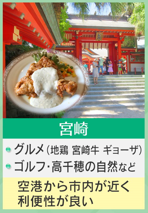 そんな中、鳥海さんおススメの国内旅行の穴場スポットですが、まずは『宮崎』です。グルメは地鶏・宮崎牛・ギョーザなどがあり、ゴルフ・高千穂の自然なども楽しめます。何よりも空港から市内が近く、利便性が良いとのことです。