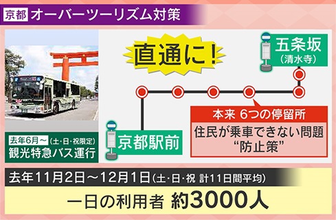 京都のオーバーツーリズム対策ですが、2024年6月から土・日・祝日限定で『観光特急バス』を運行しています。主に観光客向けのバスで、『京都駅前』から『五条坂(清水寺)』まで直通で結ぶ路線です。本来は間に6つの停留所がありますが、観光客が乗車することで、地元住民がバスに乗車できないという問題があり、防止策が取られています。2024年11月からの約1か月間の平均利用者数は約3000人だということです。