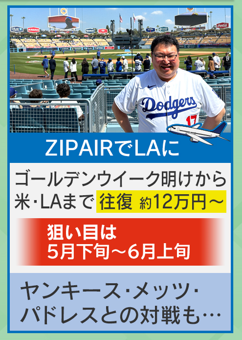 「6月中旬から下旬ぐらいまでが、年間通じて航空券往復12万円で、これもセールが出ると、8万円、9万円のときもあります。大谷翔平選手を見に行くなら、ちょうどこの5月下旬から6月上旬に『ドジャー・スタジアム』で、ヤンキース・メッツ・パドレスとの対戦が結構続きます。ヤンキースは2024年のワールドシリーズ戦の再現というのもあるので、そこで行くのがおススメです。