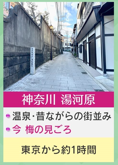 そして『神奈川・湯河原』です。温泉や昔ながらの街並みもあり、3月上旬までは梅が見頃で、東京からも約1時間でいけるといいます。