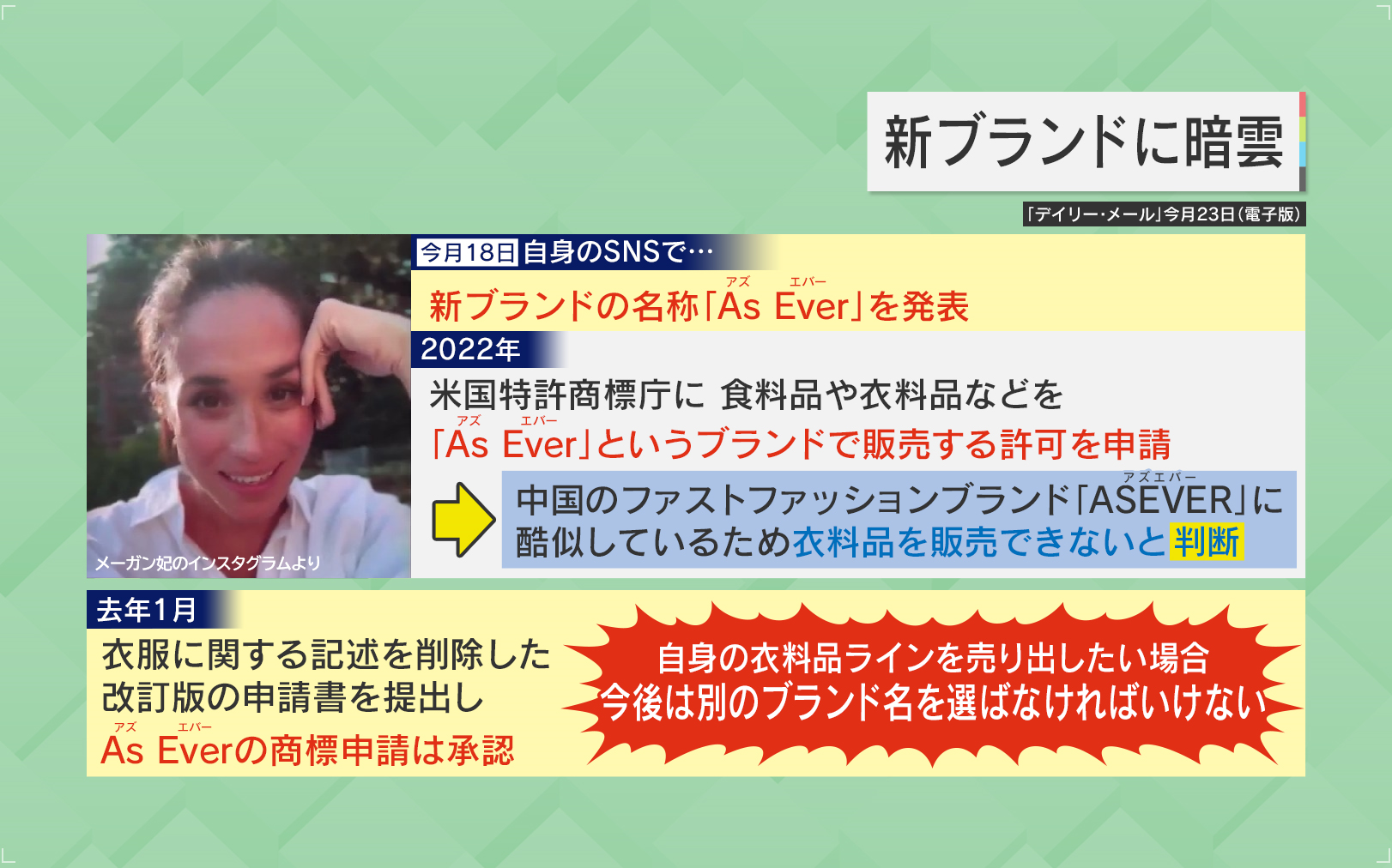 2025年2月18日、メーガン妃は新たなブランドの名称『As Ever』を発表しました。2022年には米国特許商標庁に、食料品や衣料品などを『As Ever』というブランドで販売する許可を申請していましたが、中国のファストファッションブランド『ASEVER(アズエバー)』に名前が酷似しているため、『衣料品を販売できない』という判断が下っていました。