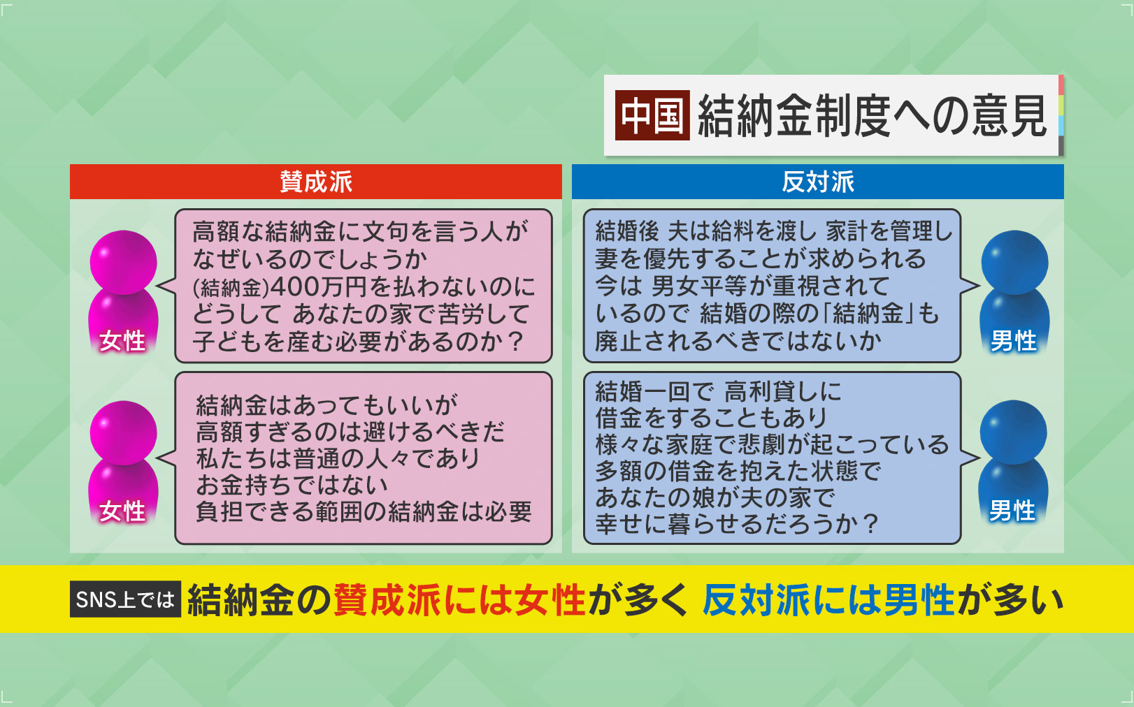 一方で、男性からは「今は男女平等が重視されているので、結婚の際の『結納金』も廃止されるべきではないか」「結婚一回で高利貸しに借金をすることもあり、様々な家庭で悲劇が起こっている」といった声がありました。