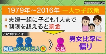 そして、2016年まで続いた『一人っ子政策』の影響もあります。終わったからといって出生率がすぐに回復するわけではなく、2023年末には男性が女性よりも約3090万人も多くなっていて、男女比率に偏りも出ています。