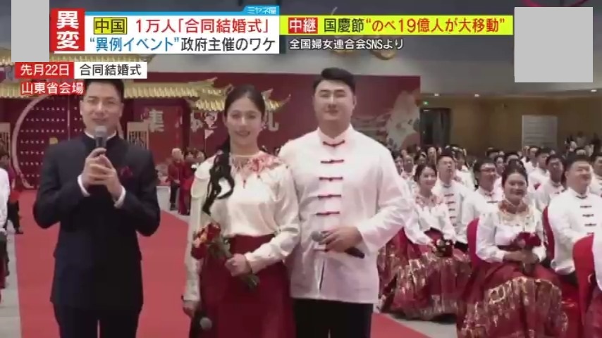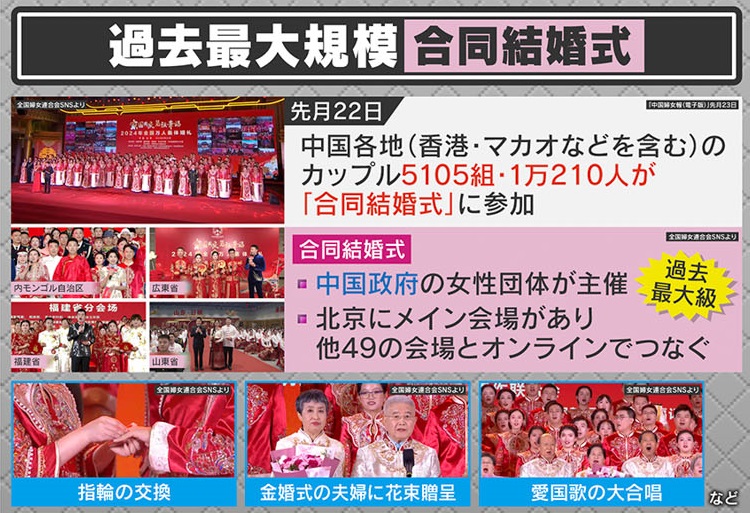 2024年9月22日、中国政府の女性団体が主催した『合同結婚式』に、中国各地(香港・マカオなどを含む)のカップル5105組・1万210人が参加。メイン会場は首都・北京ですが、その他49の会場とオンラインで繋いで行われたという過去最大級のものでした。式の中では、指輪の交換・金婚式の夫婦に花束贈呈・『愛国歌』の大合唱などがあったということです。