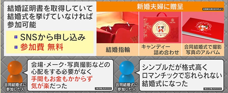 結婚証明書を取得していて、結婚式を挙げていなければ参加可能で、申し込みはSNSから。参加費は無料でしたが、結婚指輪・キャンディーの詰め合わせ・合同結婚式で撮影した写真のアルバムなどの贈呈がありました。