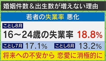 婚姻件数・出生数が増えない大きな理由は、若者の失業率の悪化です。2024年8月の若者の失業率は18.8%で、将来への不安から恋愛に消極的になっているとみられます。