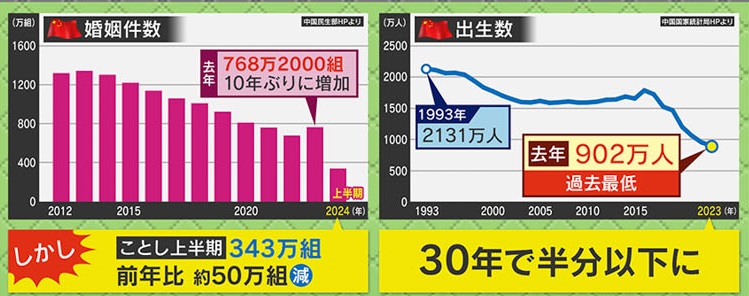2013年をピークに減っている中国の婚姻件数は、2023年はコロナ禍の反動もあり10年ぶりに増加しましたが、2023年・上半期と比べて2024年・上半期は約50万組減少。出生数も、2023年は902万人で統計史上過去最低となり、30年で半分以下になっています。