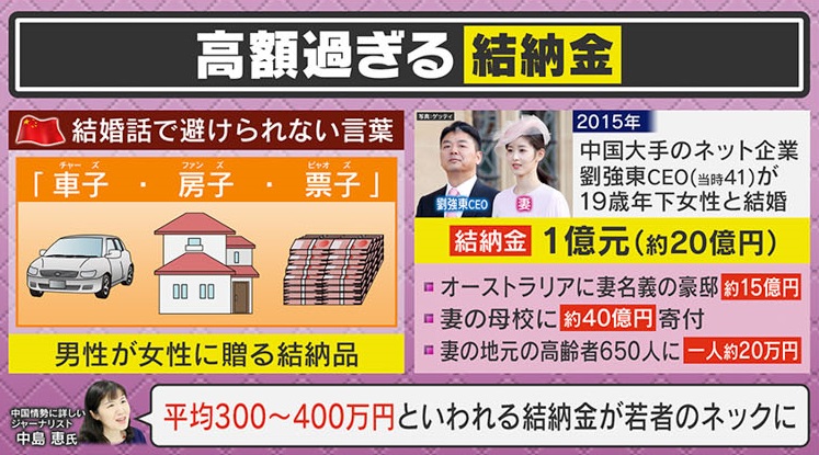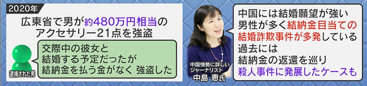 また、中島氏によると、「中国には結婚願望が強い男性が多く、結納金目当ての結婚詐欺事件が多発している。過去には、結納金の返還を巡って殺人事件に発展したケースも」ということです。
