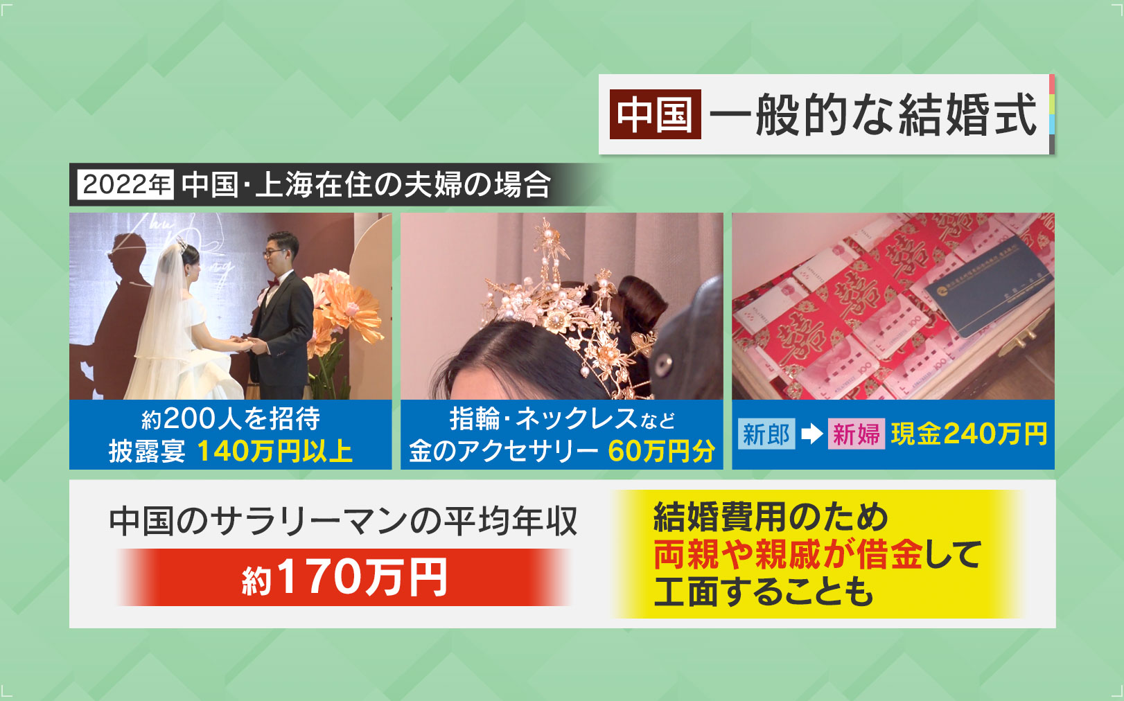 中国のサラリーマンの平均年収が約170万円といわれる中、すでに平均年収の約2.5倍の出費に。結婚費用のため、両親や親戚が借金してまで工面することもあるということです。