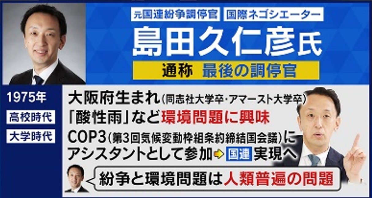 島田さんは大阪府の生まれで、高校時代に環境問題に興味を持ち、同時に国連にも興味を持ったと言います。その後、大学時代にCOP3(第3回気候変動枠組条約締結国会議)にアシスタントとして参加して“国連の夢”を実現しました。「紛争と環境問題は人類普遍の問題だ」と言い、1998年から国連紛争調停官として国連に勤務しています。今までコソボ紛争やイラク紛争などの解決に関わっています。