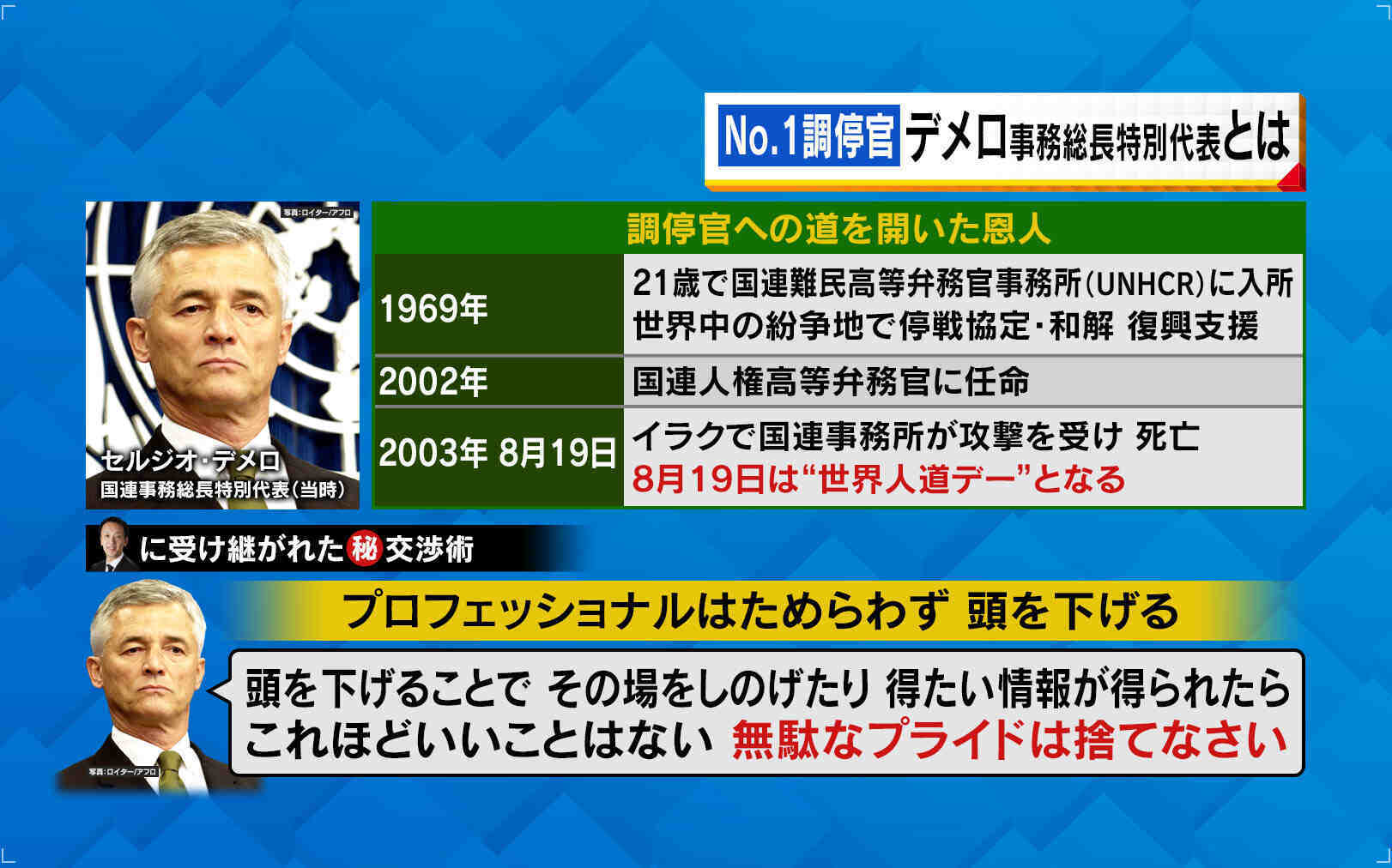 セルジオ・デメロ氏は21歳でUNHCR(国連難民高等弁務官事務所)に入所して、世界中の紛争地で停戦協定などに携わりました。2002年からは国連人権高等弁務官に任命されましたが、2003年8月19日、イラクで国連事務所が攻撃を受け、亡くなりました。この8月19日は、「世界人道デー」となっています。