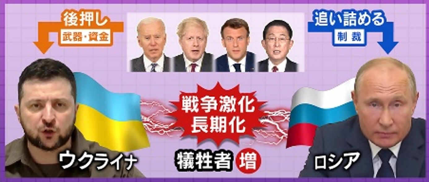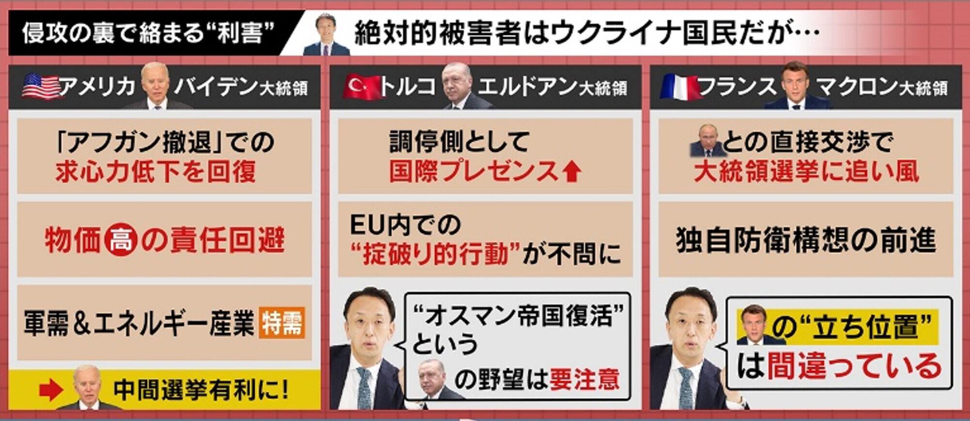 「バイデン大統領のこの戦争への思いは、アフガン撤退での求心力低下の回復や、物価高に対する責任回避ができるというのもあります。最近アメリカの国防省が、『このウクライナとロシアの戦争は、あと1年くらい続くと思う』と言い出しました。下衆な言い方ですが、長く続くとアメリカの“軍需産業”も“エネルギー産業”も儲かるんで、中間選挙が“有利”になるんです。まさかそれを狙ってはいないですよね?と聞きたくなります」