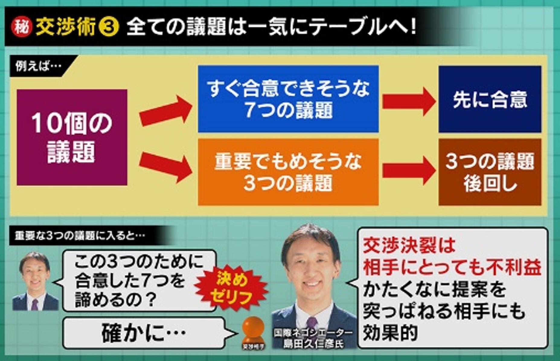 「10の交渉事があったら、一度10個全部話をさせるんです。1つずつ時間を決めて、時間が来たら切って、10個全部の交渉をします。決まるものは決めてドンドン進めます。全部終わると、結果7つくらいは合意しています。その後、残る3つを集中して話し合うんですが、合意できないときがあります。そういうときに『ここまで7つ合意しているのに、この3つはそんなに重要なんですか?この7つの合意を消すくらいなんですか?』と言うんです」