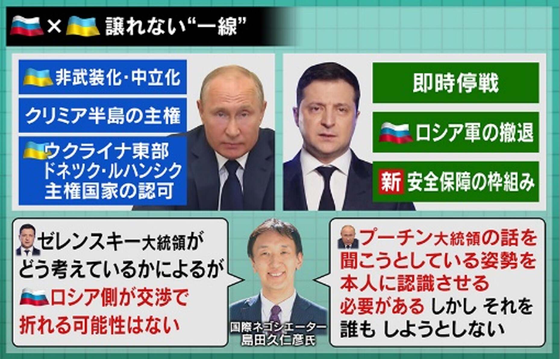 ロシアとウクライナの停戦交渉ですが、島田さんは「ロシア側が交渉で折れる可能性はない。プーチン大統領の話を聞こうとしている姿勢を大統領に認識させる必要があるが、誰もしようとしていない」と言います。