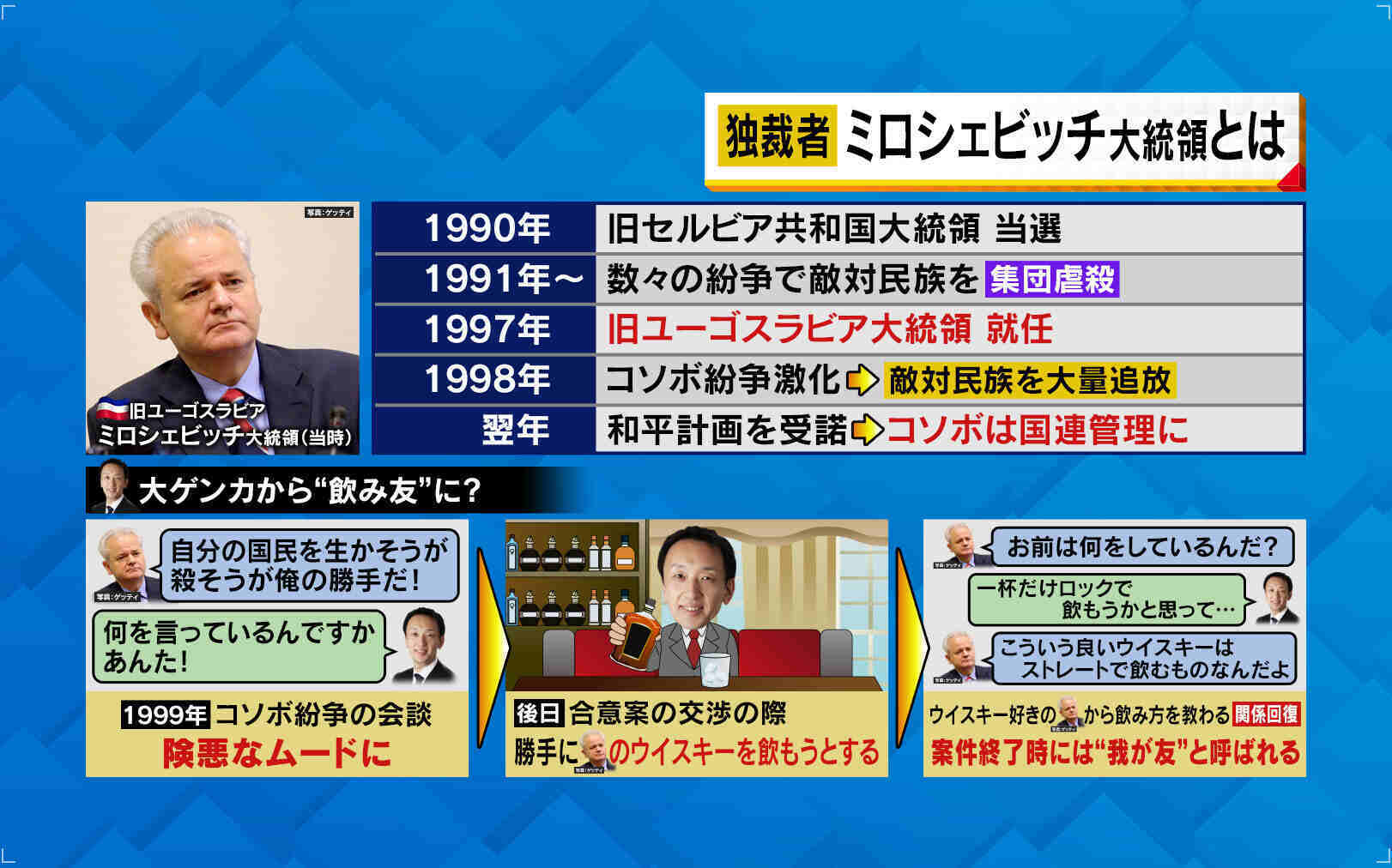「交渉の休憩時間中に、大統領執務室に誰もいなくなったんです。その時、茶色い液体が目に入って、『きっとこの人が飲むウイスキーはおいしいんじゃないかな』と思ってグラスに入れかけたら、ミロシェビッチ氏が戻って来て『お前は何をしているんだと』言うので、『一杯だけロックで飲もうかと思って…』と答えたら、『こういういいウイスキーはストレートで飲むものなんだよ』と、真面目に教えてくれて、このことをきっかけに関係が回復しました。案件が終わったときには、『わが友』と呼ばれました」