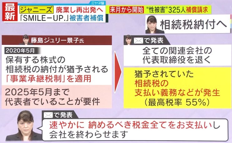 「SMILE-UP.」は、藤島ジュリー景子氏が取締役に就任し、株を100%所有し続けます。現在は相続税を猶予してもらえる「特例措置」を受けていますが、代表権を返上し、相続税を支払うという形になり、被害者の補償のみ行い、いずれは廃業させるということです。