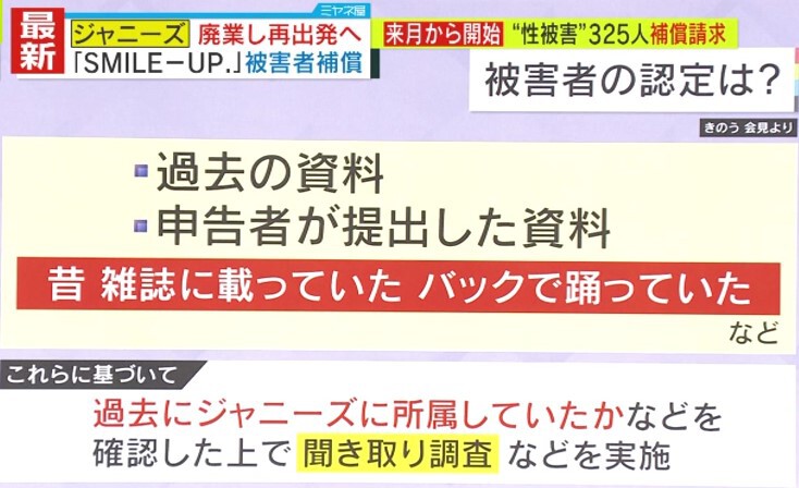 そして、被害者の認定については会見で、過去の資料・申告者が提出した資料や、昔雑誌に載っていた・バックで踊っていた事実などに基づき、過去にジャニーズ事務所に所属していたかなどを確認したうえで、聞き取り調査などを実施するということでした。