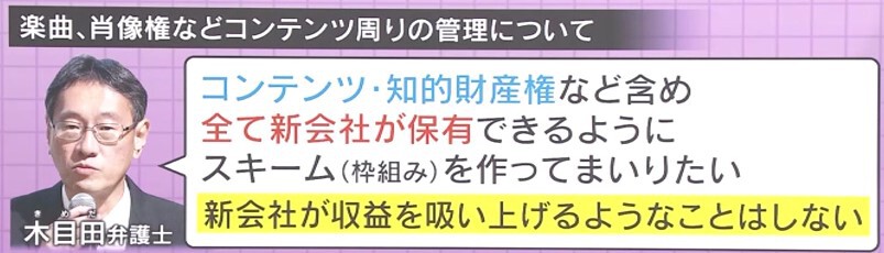 そして、楽曲・肖像権などコンテンツ周りの管理について、会見に同席していた木目田弁護士は、「コンテンツ・知的財産権など含め、全て新会社が保有できるようにスキーム(枠組み)を作ってまいりたい。新会社が収益を吸い上げるようなことはしない」としています。