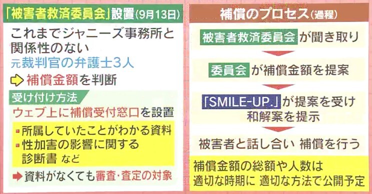 補償のプロセスは、被害者救済委員会が聞き取りを行い、補償金額を「SMILE-UP.」に提案、その提案を受けて和解案を提示し、被害者と話し合い補償を行っていきます。補償金額の総額や人数は、適切な時期に適切な方法で公開していくとしています。