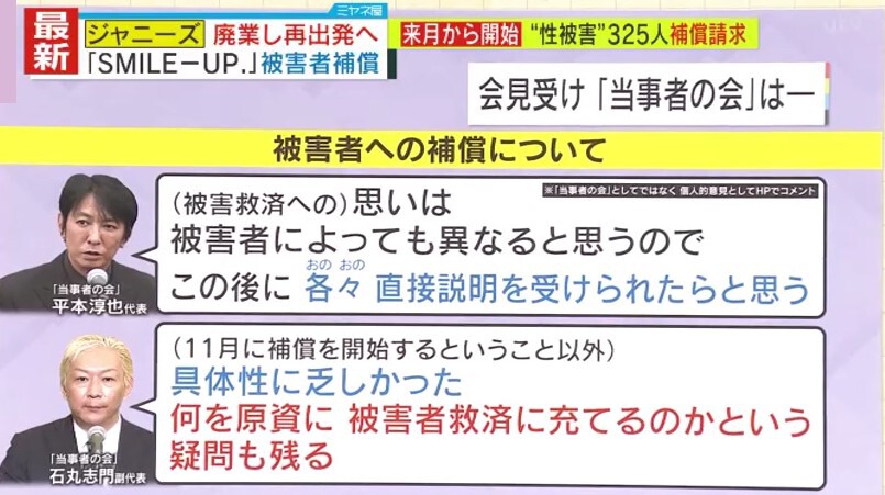 「当事者の会」石丸副代表は、「オーディションで被害に遭い、ジャニーズJr.にすらなれなかった被害者も、たくさんいる。今のフォーマットだと、在籍日などを書かなければ被害を申告できない仕組みになっているので、ぜひ『SMILE-UP.』には変えていただきたい」と話しています。