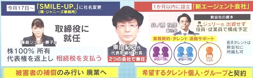 10月17日付で、現ジャニーズ事務所は「SMILE-UP.」(スマイルアップ)に社名を変更。1か月以内に新たな「エージェント会社」を設立し、この2つの会社で、東山紀之氏は社長という立場になることが発表されました。